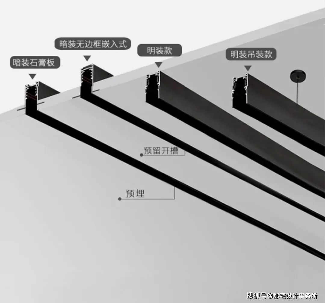 嵌入式轨道 :嵌入式轨道是暗装在吊顶内的轨道,这样的轨道安装必须要有吊顶的配合,这里需要注意一下轨道的宽度,一般有40MM和25MM两个尺寸,40MM多用于公装设计,家用建议选择25MM