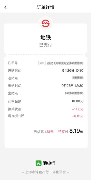 市交通委介绍,使用“随申码”乘地铁满70元享9折优惠已全面上线,绿色出行福利多多。即日起,使用“随申行”APP、“随申行”微信/支付宝小程序或“随申办”移动端乘坐地铁,当月满70元享9折优惠。如:当月已消费67元后,乘坐一次地铁为3元票价的乘次,即享受累积优惠,实际扣款金额为3*0.9=2.7元。详见↓