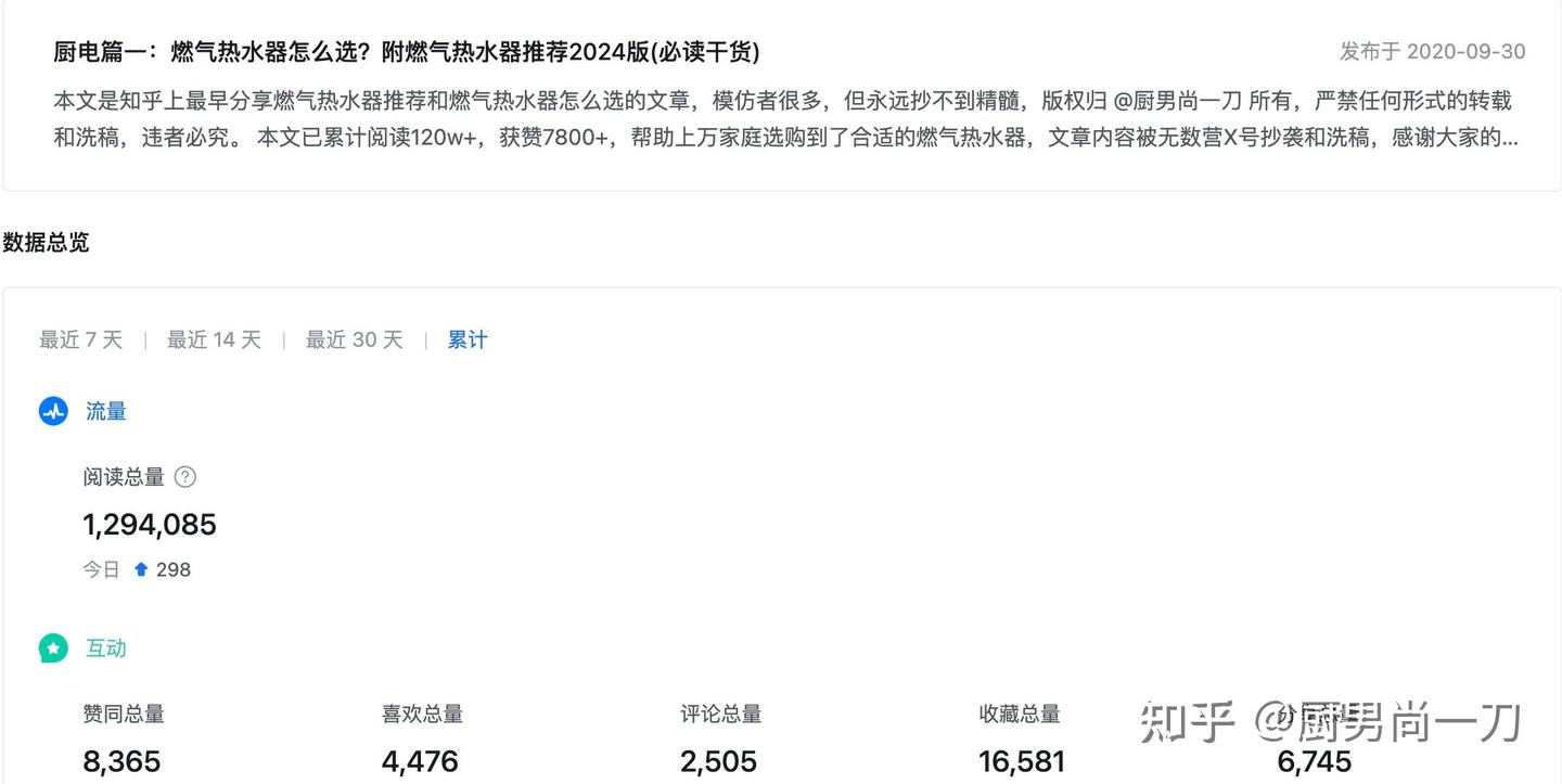 厨男的《燃气热水器怎么选?》已累计阅读120w+,获赞8000+,帮助上万家庭选购到了合适的燃气热水器,文章内容被无数营X号抄袭和洗稿,感谢大家的认可。