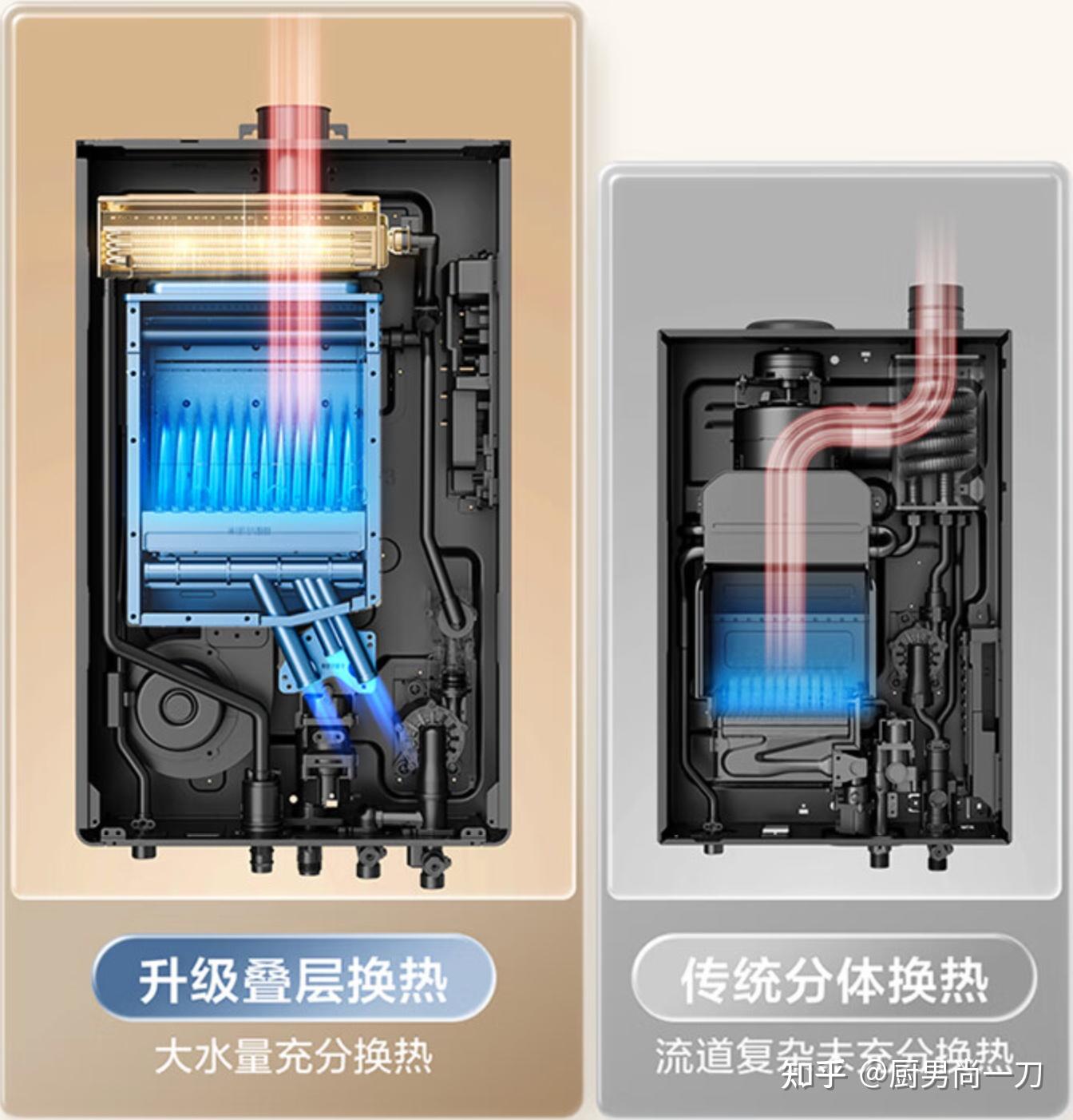 新设计在旗舰机型下置风机、15排大火排等配置基础上,在排烟口又加入一层蓄热能力更强的不锈钢热交换器,将燃烧废气中的热量回收,用来对冷水进行预热。