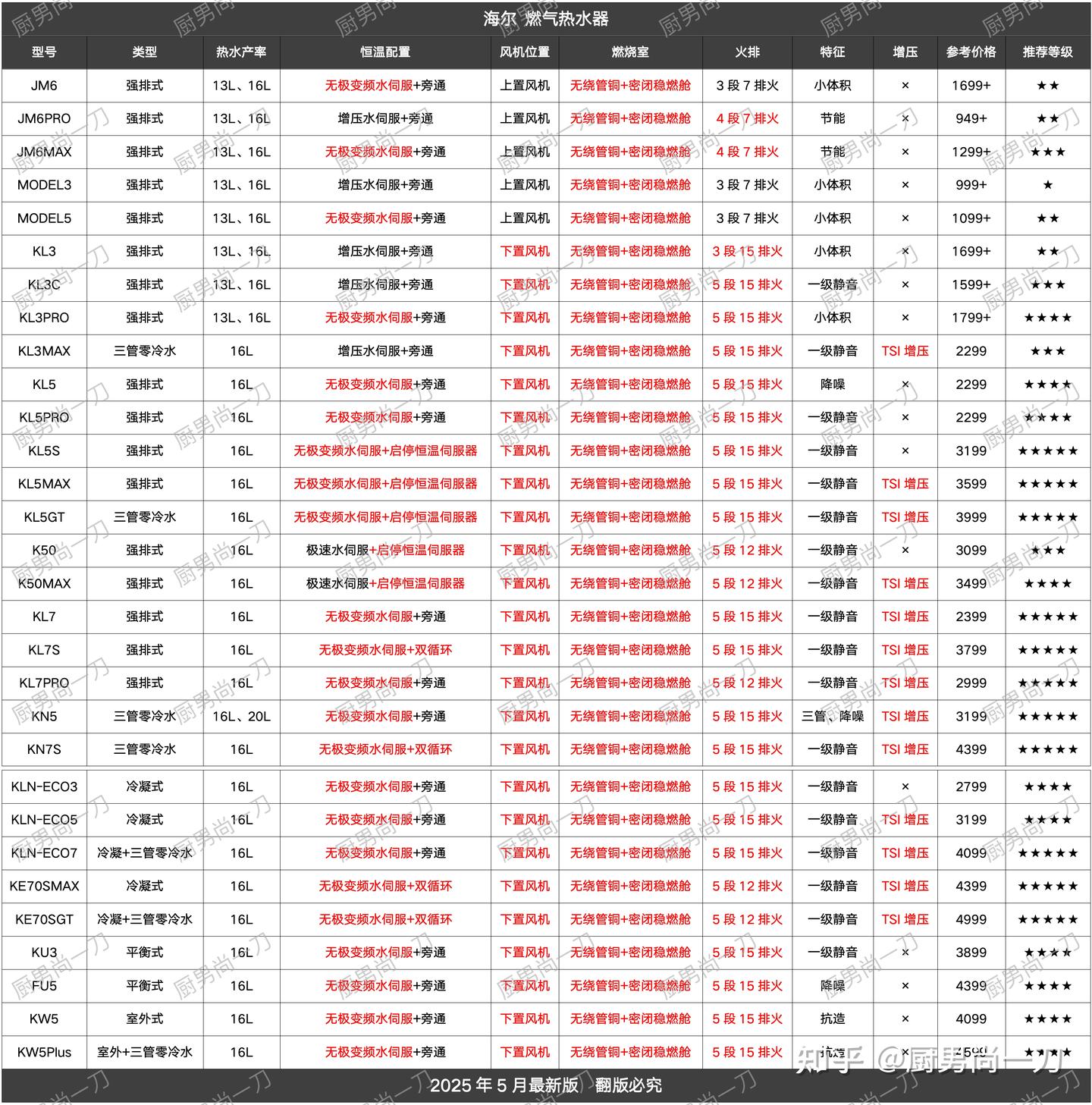 4、海尔KL5、KL5PRO、KL5S、KL5MAX、KL5GT、K50、K50MAXKL5采用无级变频水伺服,下置风机,无绕管密闭稳燃舱,5分段15排火,除了玻璃面板,核心配置与升级后的KL3PRO基本一模一样,而且没有13L可选,所以不用再关注。