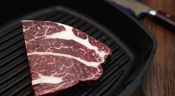这个部位,这几年火到不行,因为它的油脂花纹实在太漂亮,但我一直不太爱,因为油脂多,吃起来太腻。煎过头的话,筋膜也是不少,所以吃起来有点嚼不动。牛小排最合适的就是韩式烤或者明火烧烤,迅速逼走油脂,又不至于太老。在家用锅煎,确实不太容易做得出彩。