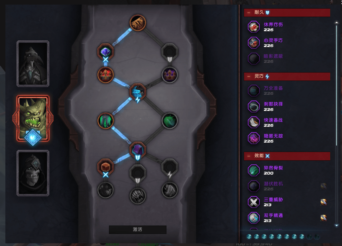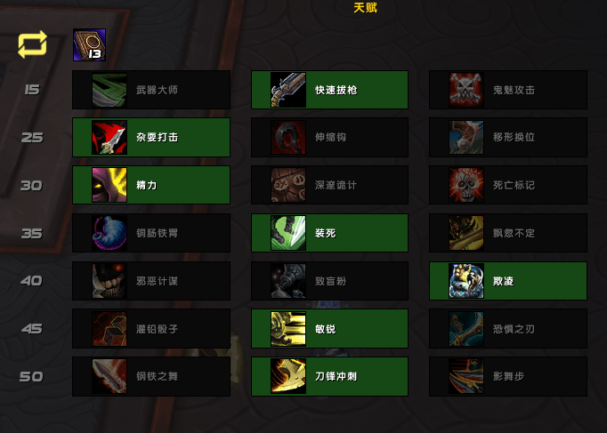 天赋上选择“2112322”,这是一套适合新手的天赋,分别点出“快速拔枪”、“杂耍打击”、“精力”、“装死”、“欺凌”、“敏锐”与“刀锋冲刺”。该天赋适用于大秘境环境,在团本环境下,需要将30级天赋的“精力”换为“深邃诡计”。