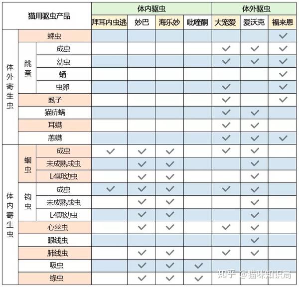 硕腾旗下拥有宠物用驱虫药品牌有:大宠爱、欣宠克、内宠爱、妙宠爱等; 宠物用疫苗品牌有:妙三多、卫佳捌、卫佳伍、瑞比克等。拜尔因为名气大,市面上假货较多,务必找靠谱卖家购买或专业医院购买;南方夏天是心丝虫从高发季,建议此时可以选大宠爱或爱沃克以预防及治疗;海乐妙(国)和妙巴(进)成分一致,进口贵国产便宜,请酌情自行选择;驱虫药本身有毒性,一定要按照说明书上的要求严格控制药量。剂量的多少是按照猫咪的体重大小来衡量的,所以在喂食驱虫药之前一定要称好猫咪的体重。本文参考文献: