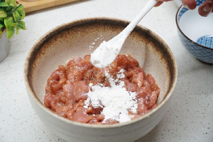 1、猪里脊冲洗后切成2至3毫米的肉片,切好的肉片用刀背拍打两下,放进碗中接清水,加盐抓洗浸泡10分钟,泡出血水洗净控水,放少许盐和料酒腌30分钟。