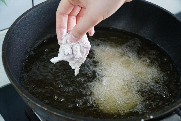 4、炸锅里倒油烧热,油温升到六成热后,将肉片下入锅中油炸,炸至两面金黄捞出,全部炸完后,将油温再次加热,温度达到八成热后,倒入肉片复炸,炸到金黄酥脆后关火捞出控油。