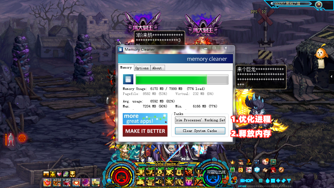 就像鱻鱼刚开游戏时占用66%内存,在人多的地方长时间站街高达90%,使用软件以后下降77%(还开了其他软件)。(PS:最重要的是不会影响游戏本身)