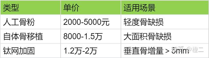 轻度骨缺损:需0.5g骨粉+1片骨膜,总成本约2000-4000元重度骨吸收:需2-3g骨粉+2片骨膜,总成本约8000-1.2w元