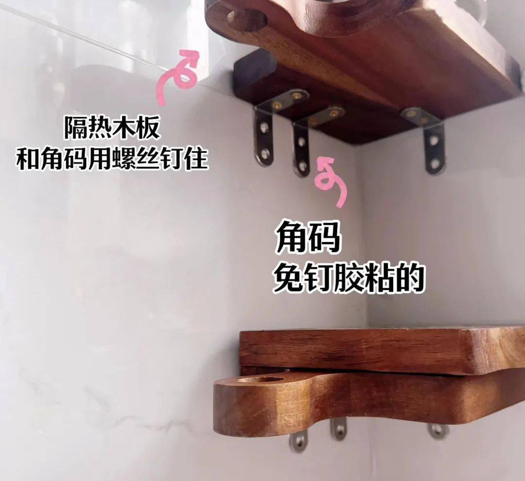 用免钉胶粘几个角码到瓷砖墙上,然后把木锅垫用螺丝和角码固定钉住!