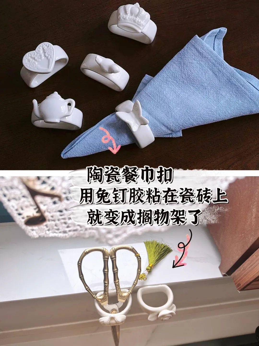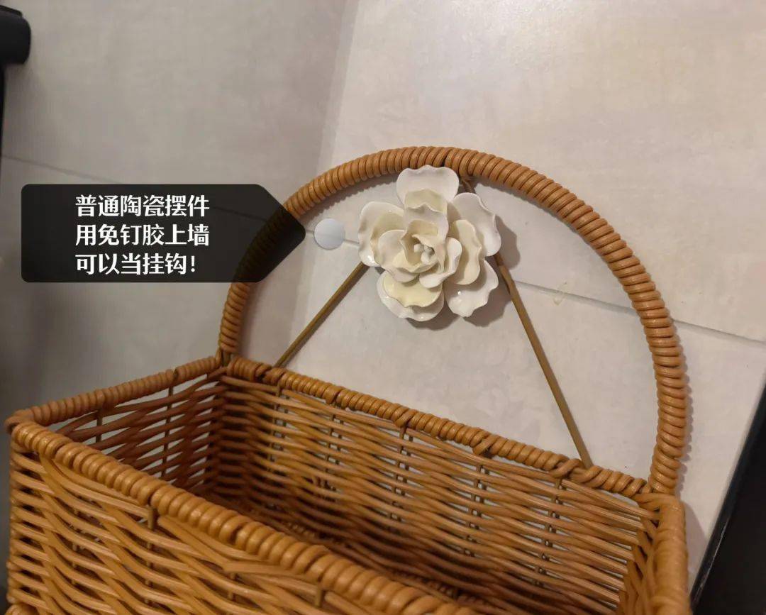 还有陶瓷小花,本来只是普通的陶瓷小摆件,但是用免钉款粘上墙,就是挂钩!