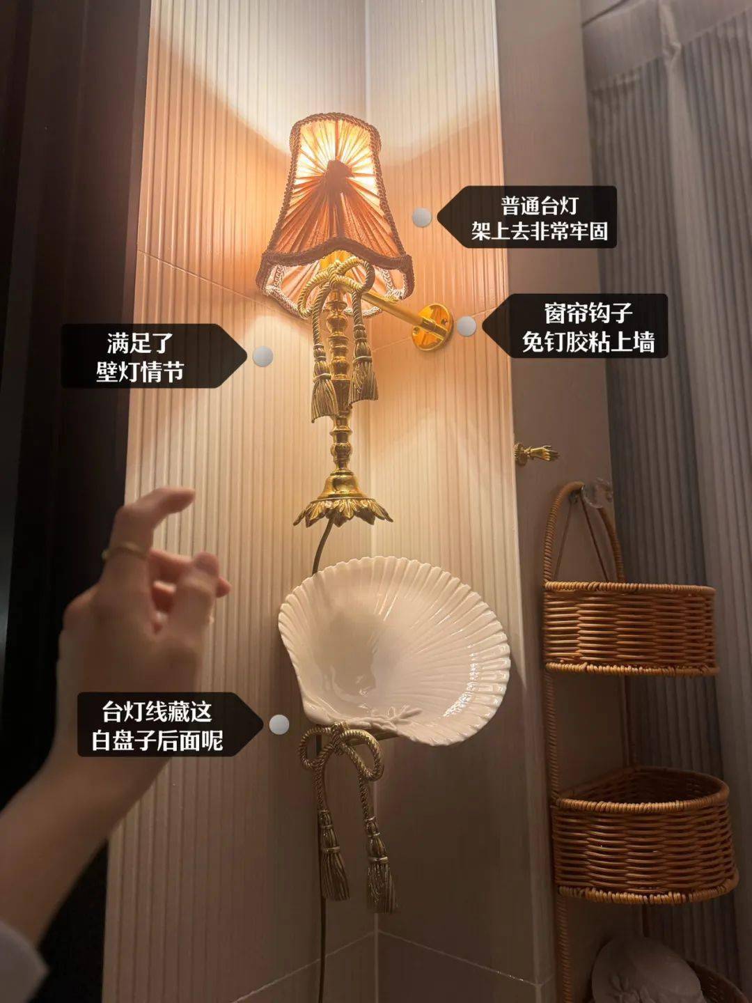 就是下面这样,粘好后,把一个法风台灯卡上面、台灯线拖下去插个电源就好了: