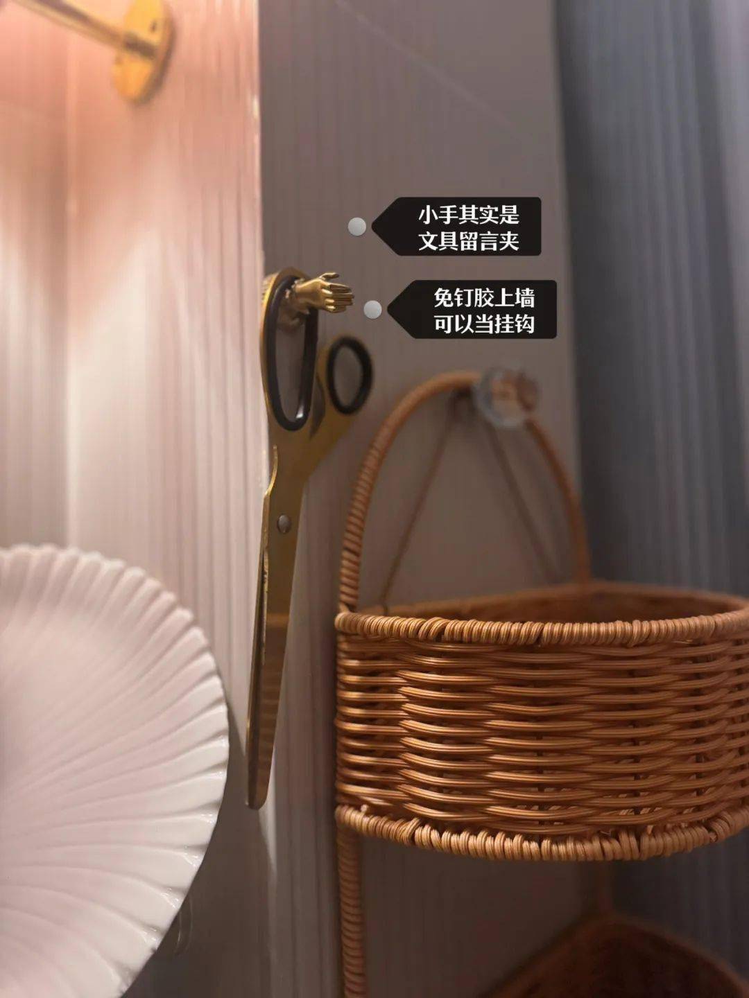 然而,它其实本来是一个文具!是留言卡夹,用免钉胶把它粘上墙,才变成了挂钩!