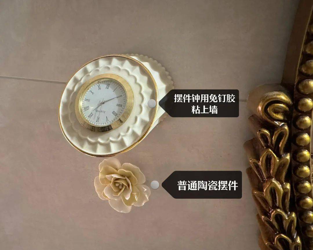 我还用免钉胶,把陶瓷摆件钟,粘上了卫生间的墙,又别致又实用,早上起来洗漱也能一眼瞄到时间: