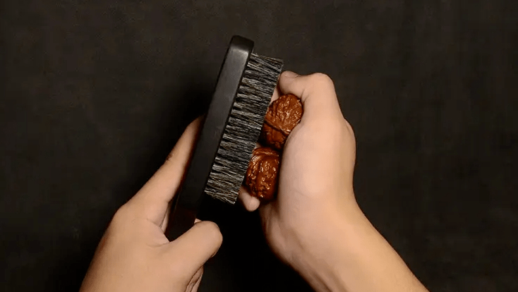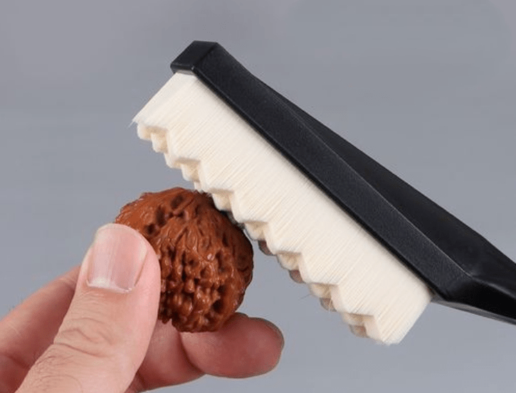 当文玩核桃在经过一段时间的盘玩后,逐渐形成了初步的包浆,这时候就可以考虑使用猪鬃刷来进一步加深核桃的色泽和质感。猪鬃刷的刷毛由猪的鬃毛制成,具有一定的油性和韧性,它能够有效地促进文玩核桃表面形成更加均匀、深沉的包浆。猪鬃刷的刷毛能够将核桃表面的污垢和杂质清除干净,同时将表面的包浆抚平,使核桃更加光滑、油亮,散发出一种独特的光泽。