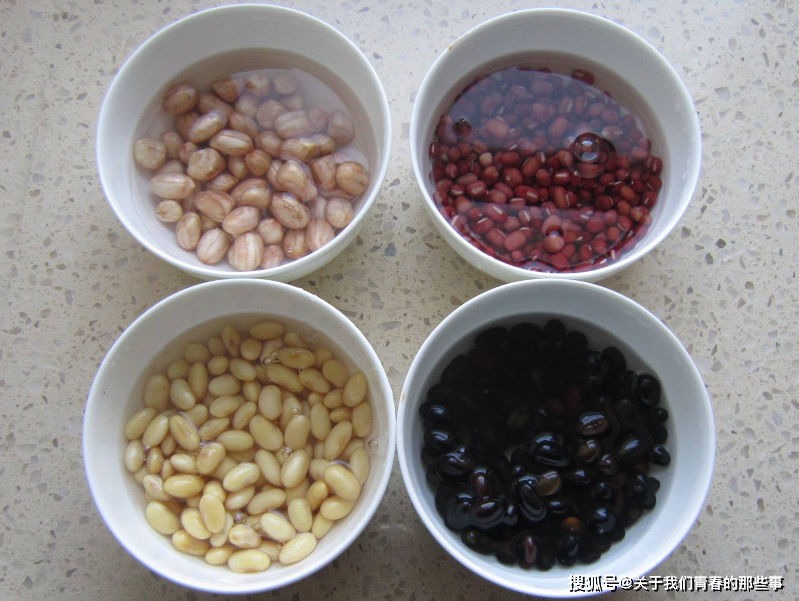 1、准备好食材,拿4个小碗,倒入豆子和花生,加适量清水浸泡一晚上,让豆子和花生都充分吸水,花生米搓掉花生皮(其实花生皮的营养价值很高,可以不去掉,但去掉后口感更好。)