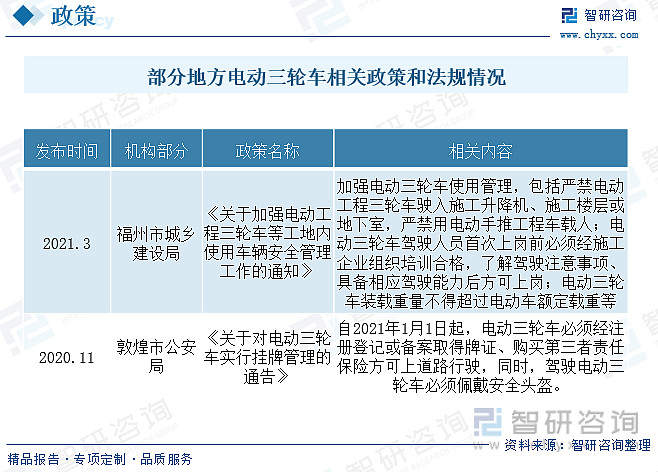 电动三轮车属于低速电动车,整体政策导向趋向管理逐步严格,是电动三轮车健康发展的关键。目前细分至电动三轮车实际政策较少,部分地区如敦煌市要求自2021年1月1日起,电动三轮车必须经注册登记或备案取得牌证、购买第三者责任保险方可上道路行驶,同时,驾驶电动三轮车必须佩戴安全头盔。受监管影响,消费者购买目录上牌车的热情空前高涨。当下全国多地公安交警展开三轮车整治与规范活动,要求三轮车出行必须具备资质。由当下的管理政策可以看出,规范化、资质化已经成为电三行业的市场主流。