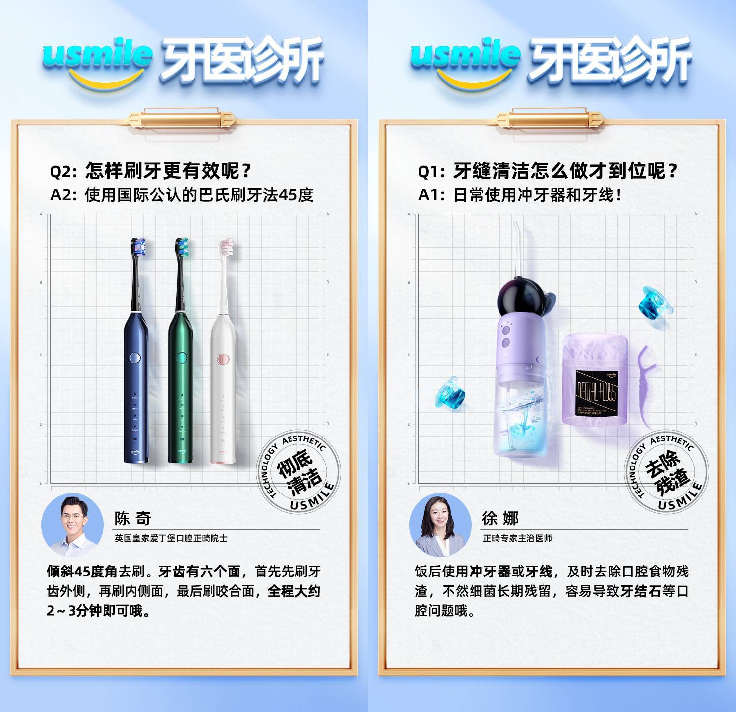 当然,售后体系仅仅是usmile强大的品牌服务体系中的一环,在售后之外,usmile通过不同的形式为用户提供全面专业的口腔服务,例如:专题 #usmile口腔诊所#、#口腔知识小卡片#等,以生活场景带入,通过还原真实案例帮助消费者轻松学会产品使用与保养,避免口腔护理误区。