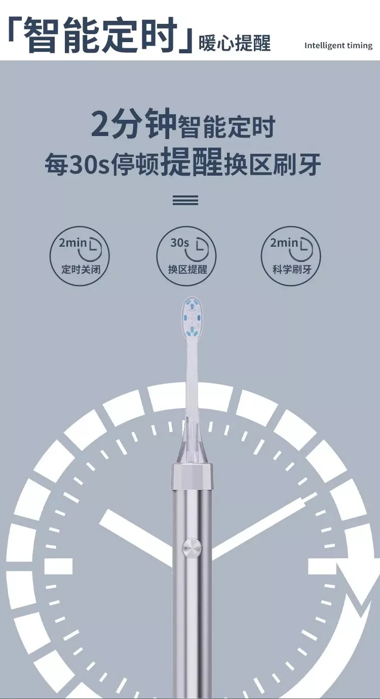 还有贴心的定时设计,每30秒就会停顿提醒换区刷牙,刷足2分钟,就会自动停止,以防刷牙时间过长,造成牙齿损伤。