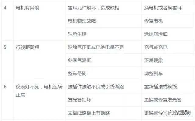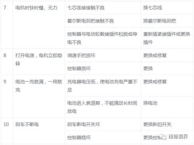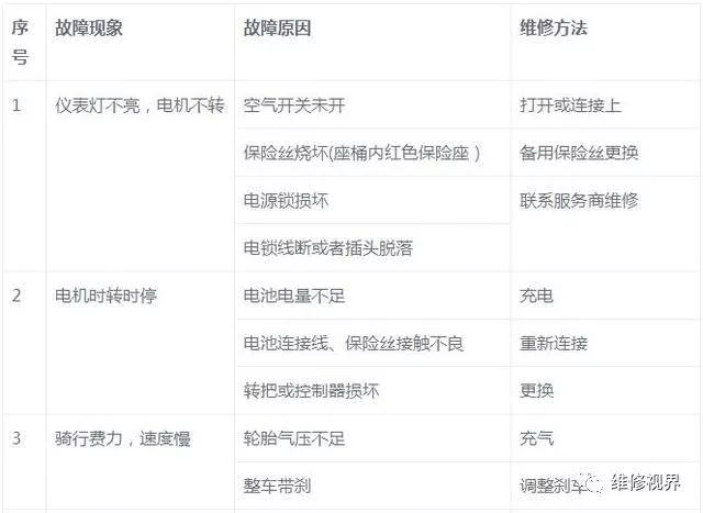 不要小看电动车灯泡这一块,现有的双丝灯泡的公共极不一样,如果与线缆未匹配好会导致灯泡的工作不正常,严重会导致一开大灯整车不动的情况,这一块要重视一下。电动车常见小故障维修表格: