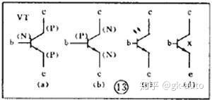 由于 PNP 型和 NPN 型三极管在使用时对电源的极性要求是不同的,所以在三极管的图形符号中应该能够区别和表示出来。图形符号的标准规定:只要是 PNP 型三极管,不管它是用锗材料的还是用硅材料的,都用图 13 ( a )来表示。同样,只要是 NPN 型三极管,不管它是用锗材料还是硅材料的,都用图 13 ( b )来表示。图 13 ( c )是光敏三极管的符号。图 13 ( d )表示一个硅 NPN 型磁敏三极管。