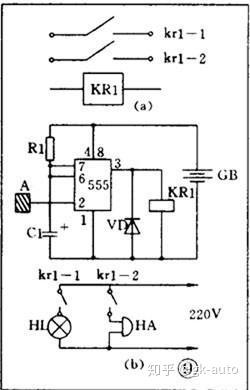 因为继电器是由线圈和触点组两部分组成的,所以继电器在电路图中的图形符号也包括两部分:一个长方框表示线圈;一组触点符号表示触点组合。当触点不多电路比较简单时,往往把触点组直接画在线圈框的一侧,这种画法叫集中表示法,如图 9 ( a )。当触点较多而且每对触点所控制的电路又各不相同时,为了方便,常常采用分散表示法。就是把线圈画在控制电路中,把触点按各自的工作对象分别画在各个受控电路里。这种画法对简化和分析电路有利。但这种画法必须在每对触点旁注上继电器的编号和该触点的编号,并且规定所有的触点都应该按继电器不通电的原始状态画出。图 9 ( b )是一个触摸开关。当人手触摸到金属片 A 时, 555 时基电路输出( 3 端)高电位,使继电器 KR1 通电,触点闭合使灯点亮使电铃发声。 555 时基电路是控制部分,使用的是 6 伏低压电。电灯和电铃是受控部分,使用的是 220 伏市电。