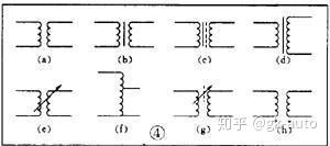 变压器的图形符号见图 4 。其中( a )是空芯变压器,( b )是滋芯或铁芯变压器,( c )是绕组间有屏蔽层的铁芯变压器,( d )是次级有中心抽头的变压器,( e )是耦合可变的变压器,( f )是自耦变压器,( g )是带可调磁芯的变压器,( h )中的小圆点是变压器极性的标记。