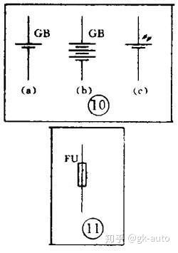 电池的图形符号见图 10 。长线表示正极,短线表示负极,有时为了强调可以把短线画得粗一些。图 10 ( b )是表示一个电池组。有时也可以把电池组简化地画成一个电池,但要在旁边注上电压或电池的数量。图 10 ( c )是光电池的图形符号。电池的文字符号为“ GB ”。熔断器的图形符号见图 11 ,它的文字符号是“ FU ”。