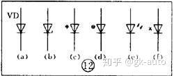 半导体二极管在电路图中的图形符号见图 12 。其中( a )为一段二极管的符号,箭头所指的方向就是电流流动的方向,就是说在这个二级管上端接正,下端接负电压时它就能导通。图( b )是稳压二极管符号。图( c )是变容二极管符号,旁边的电容器符号表示它的结电容是随着二极管两端的电压变化的。图( d )是热敏二极管符号。图( e )是发光二极管符号,用两个斜向放射的箭头表示它能发光。图( f )是磁敏二极管符号,它能对外加磁场作出反应,常被制成接近开关而用在自动控制方面。二极管的文字符号用“ V ”,有时为了和三极管区别,也可能用“ VD ”来表示。