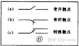 在机电式开关中至少有一个动触点和一个静触点。当我们用手扳动、推动或是旋转开关的机构,就可以使动触点和静触点接通或者断开,达到接通或断开电路的目的。动触点和静触点的组合一般有 3 种: ① 动合(常开)触点,符号见图 6 ( a ); ② 动断(常闭)触点,符号是图 6 ( b ); ③ 动换(转换)触点,符号见图 6 ( c )。一个最简单的开关只有一组触点,而复杂的开关就有好几组触点。