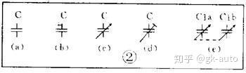 详见图2 所示,其中( a )表示容量固定的电容器,( b )表示有极性电容器,例如各种电解电容器,( c )表示容量可调的可变电容器。( d )表示微调电容器,( e )表示一个双连可变电容器。电容器的文字符号是 C 。