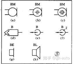 扬声器、耳机都是把电信号转换成声音的换能元件。耳机的符号见图 5 ( g )。它的文字符号是“ B E ”。扬声器的符号见图 5 ( h ),它的文字符号是“ BL ”。