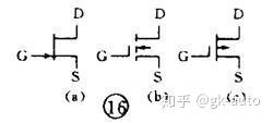 利用电场控制的半导体器件,称为场效应管,它的符号如图 16 所示,其中( a )表示 N 沟道结型场效应管,( b )表示 N 沟道增强型绝缘栅场效应管,( c )表示 P 沟道耗尽型绝缘栅场效应管。它们的文字符号也是“ VT ”。