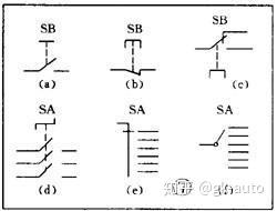 点下方表示推拉的动作;( d )表示旋转式开关,带 3 极同时动合的触点;( e )表示推拉式 1×6 波段开关;( f )表示旋转式 1×6 波段开关的符号。开关的文字符号用“ S ”,对控制开关、波段开关可以用“ SA ”,对按钮式开关可以用“ SB ”。