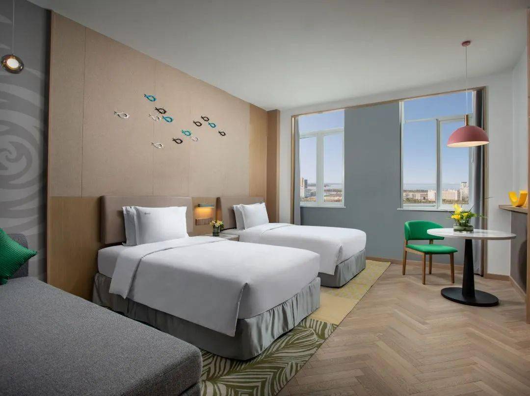 此次套餐售卖的是高级房和豪华房。客房配色以浅绿色为主,采用了水滴图案和鱼的造型,使空间更具有灵动性的同时更突出滴水湖的风貌。