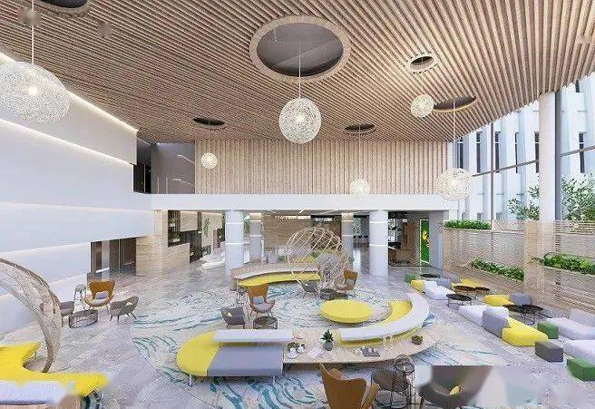 酒店的设计灵感结合滴水湖的周边景观特色,在设计的元素上采用了水的意向、方与圆的组合(滴水湖呈圆形),体现出当地特色,更好的体现了“水“,”圆形"的概念。