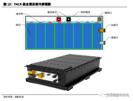 由于浸没液与电芯全方位接触,更好地控制电芯的温差水平;此外,采用非油类的冷却液时,液体本身就具有灭火能力,起到了温控与消防融合的效果。