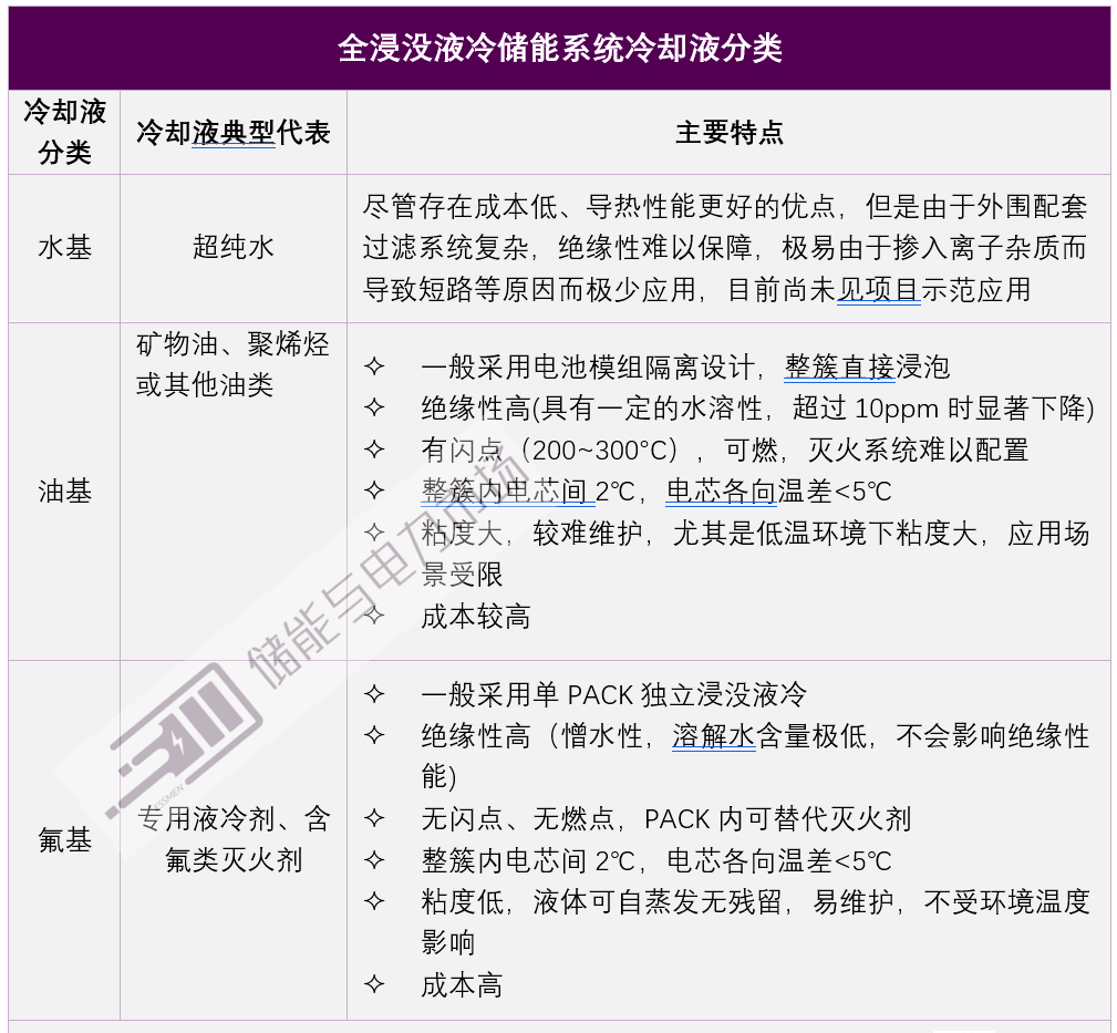 根据选择的冷却液的不同,全浸没液冷储能系统, 又可以分为水基、油基、氟基三种主要类型,其主要的特点如下表所示。