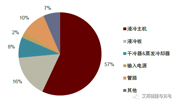 液冷方案中水冷 主机提供冷源,价值占比达到57%,约0.5亿元/GWh,是整个液冷系统中技术积累要求较高的环节;其次为 电池液冷板,成本占比约16.4%。