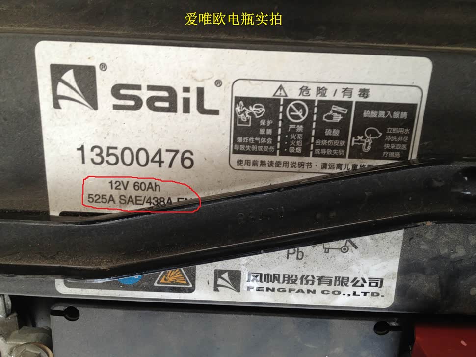 打开引擎盖,看到的是和英朗、科鲁兹一样的风帆牌电瓶,红框中的参数是指输出电压12V,容量60Ah,低温启动电流525A(SAE美国标准)/438A(EN欧洲标准)