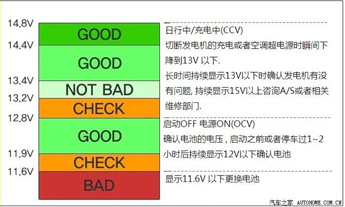 电压当汽车通电未发动,是电瓶的电压,正常数值为11.9-12.8(和气温有关,夏天高些冬天低些),低于11.6就要注意了尽快关闭车上电器并即刻发动发动机充电,接上专业电瓶检测仪器测试电容量,数值低于10就可能会无法发动。