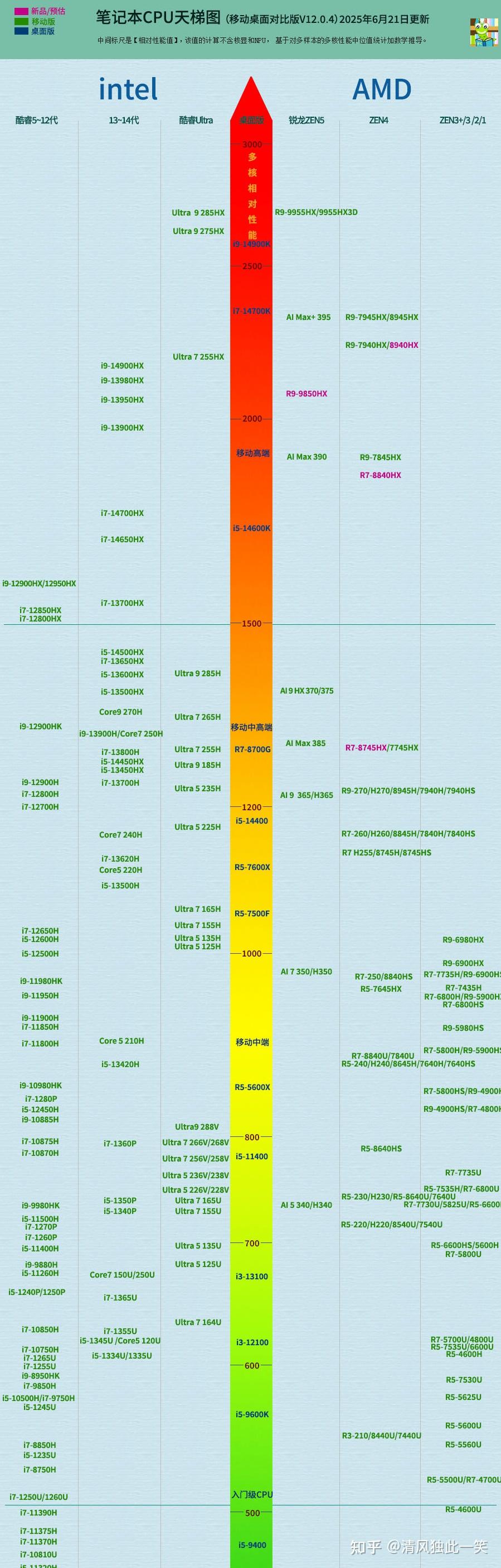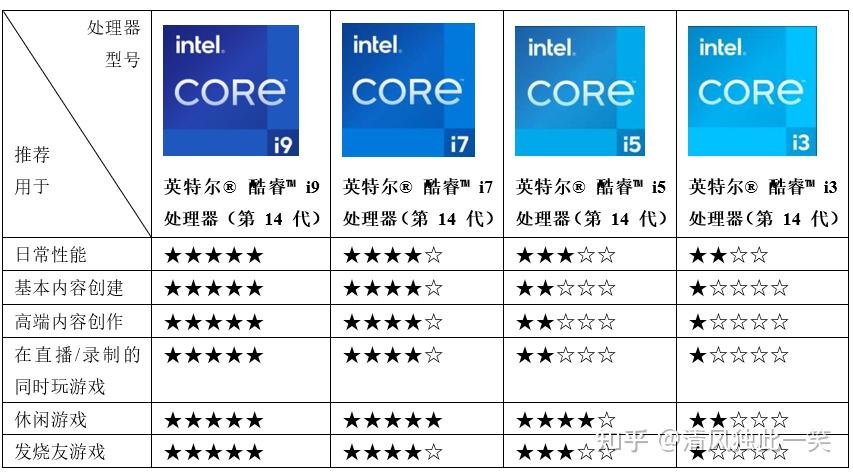 顶级性能,重度大型游戏、大型专业设计、图形处理:推荐i9-14900HX、i9-14900H等;高性能,中度大型游戏、大型专业设计、图形处理:推荐i7-14700HX、i7-14700H(性价比略低)等;中等性能、中度游戏、专业设计、图形处理:推荐i5-14500H、i5-14500H等;一般性能、日常学习、日常办公、家用:推荐i5-1440P、i3-14300H等;