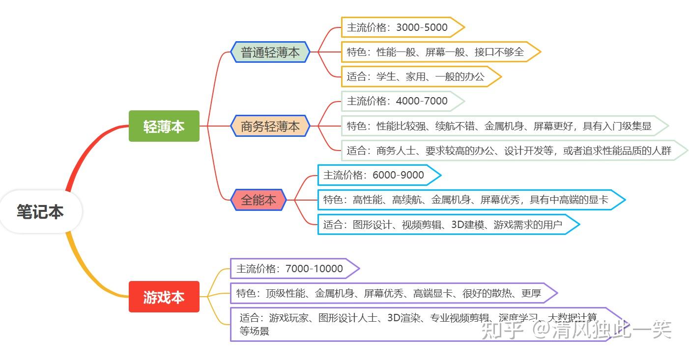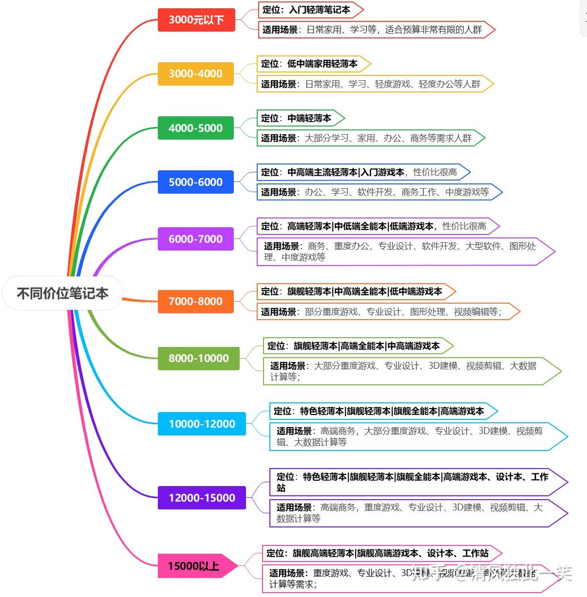 家用/学习本(入门):面向预算不高、对于性能要求不高的上网课、学习、轻度办公、追剧等需求,一般价格在三四千左右。适合家用、轻度办公、学生商务办公本(中端主流):面向商务办公的主流轻薄本,相对家用/学习本在性能、屏幕、散热、外设接口、做工与材质等方面更好一些,一般注重轻薄,价格在四五千到八九千左右(16寸会更高);适合商务、办公、对于性能有一定要求的学生或家用全能/性能本(旗舰高端):性能更高、更全面的商务本,增加了独立显卡、接口配置齐全、散热更好,综合性能很强,重量略重。兼顾轻薄与高性能,散热与性能释放等一般没有游戏本好,价格在六七千到一万多;适合对轻薄、性能、显卡要求较高的中高强度游戏、视频剪辑、3D渲染、图形设计创作、绘图、深度学习等用户;