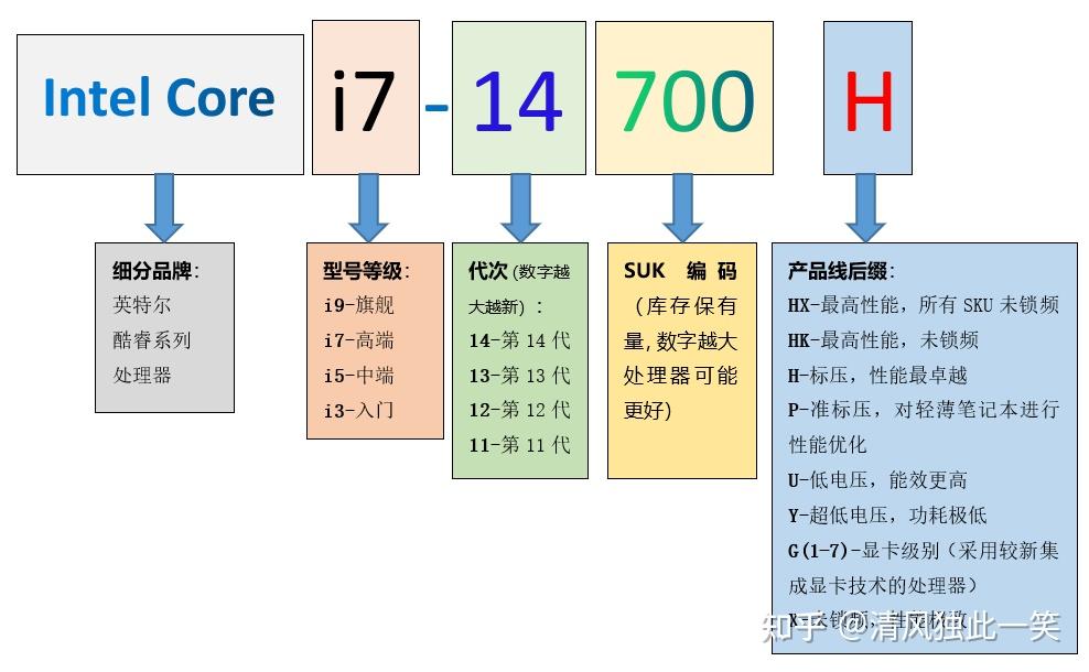 对于酷睿 第十四代 i系列处理器命名规则举例说明(13代、12代也是类似),以Intel® Core™i7-14700H处理器为例,如下图所示: