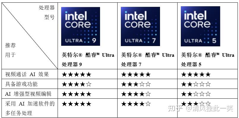 酷睿 Ultra3 :入门级,性能低不推荐。酷睿 Ultra5 :中端主流处理器主流轻薄本的主流处理器。主要特点:综合性能不错、低功耗、高能效,多任务处理能力强,具备更好的续航与更高的性价比,支持AI算力。适用于轻薄本或全能本,适合视频编辑、图像处理、在线办公和一些AI(语音识别)等使用场景,适合商务人士、学生等对性能有一定要求、注重续航能力与便携性的用户群体。最新的是酷睿Ultra5-225H处理器。酷睿 Ultra 7 高端处理器高端轻薄本的主流处理器。具备出色的多核与单核性能、高睿频、优秀的图形处理能力,在复杂多任务和图形处理方面表现出色。适用于高性能轻薄本、设计本或全能本。适合需要高性能的计算、图形处能力的用户群体,像设计师、游戏玩家和视频制作者等。最新的是酷睿Ultra7-255H、Ultra7-255HX处理器。酷睿 Ultra 9旗舰级高性能处理器,具备更强的多线程、单线程处理能力,更强的多任务处理、复杂计算任务和图形密集等高负荷计算处理能力。内置入门级独立显卡级别GPU,提供流畅的游戏体验和高效的图形处理能力。适合追求极致性能体验、较高的图形视频处理、专业设计创作、较强续航能力与AI功能的用户群体,如设计师或科研人员、高端游戏玩家等用户群体。最新的是2代酷睿Ultra9-285H、Ultra9-275HX、Ultra9-285HX处理器。英特尔酷睿 Ultra 系列对比
