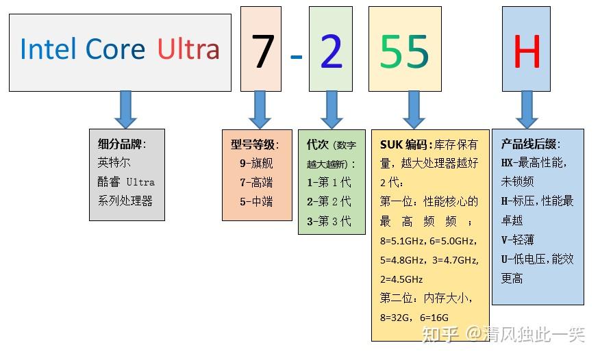 酷睿Ultra系列处理器的命名方式与酷睿i系列有些相似,以Intel® Core™Ultra 7-255H处理器为例,如下图所示:
