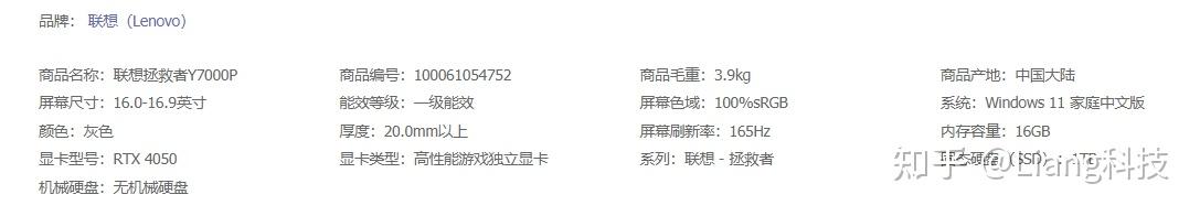 2、参数、配置为了更好地对笔记本的参数进行解释,便于朋友们理解,以这款拯救者Y7000P(13代i7-13620H 16G 1T RTX4050 2.5K 165Hz)为例,大家在网上购机时直接对照(电商平台上的信息有时候不完整,也可以到品牌的官方网站去看)。