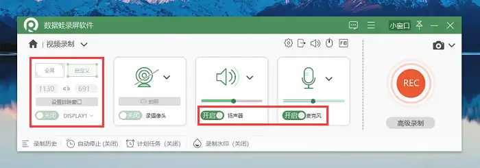 步骤2:在视频录制模式中,我们先确定好需要录制的屏幕区域,然后对录屏声音(如麦克风与扬声器)进行相对应调整。
