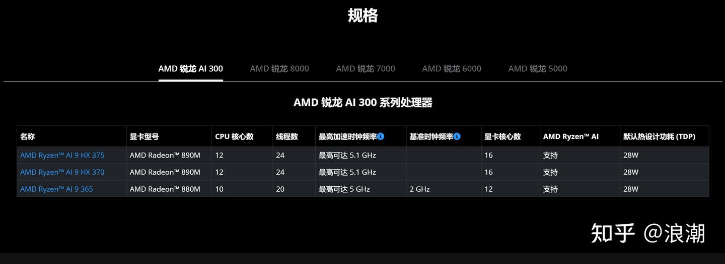 AMD篇AMD处理器目前有最新的锐龙AI 300系列,还有上代主流家常日用的锐龙8040系列处理器可选。锐龙AI 300系列采用全新的命名方式,主打一个突出AI,锐龙AI 300系列目前只发布了三款处理器型号,主要是定位旗舰高端,分别是锐龙AI 9HX 375、锐龙AI 9HX 370、锐龙 AI 9 365。