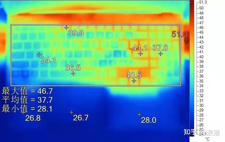 键盘表面温度在高负载的情况下,看键盘表面温度,可以看出隔热能力,隔热能力一般,键盘表面温度高,用着就感觉烫手。特别是游戏本,在选择的时候,看玩游戏经常用到的键位是否在高温区域内。