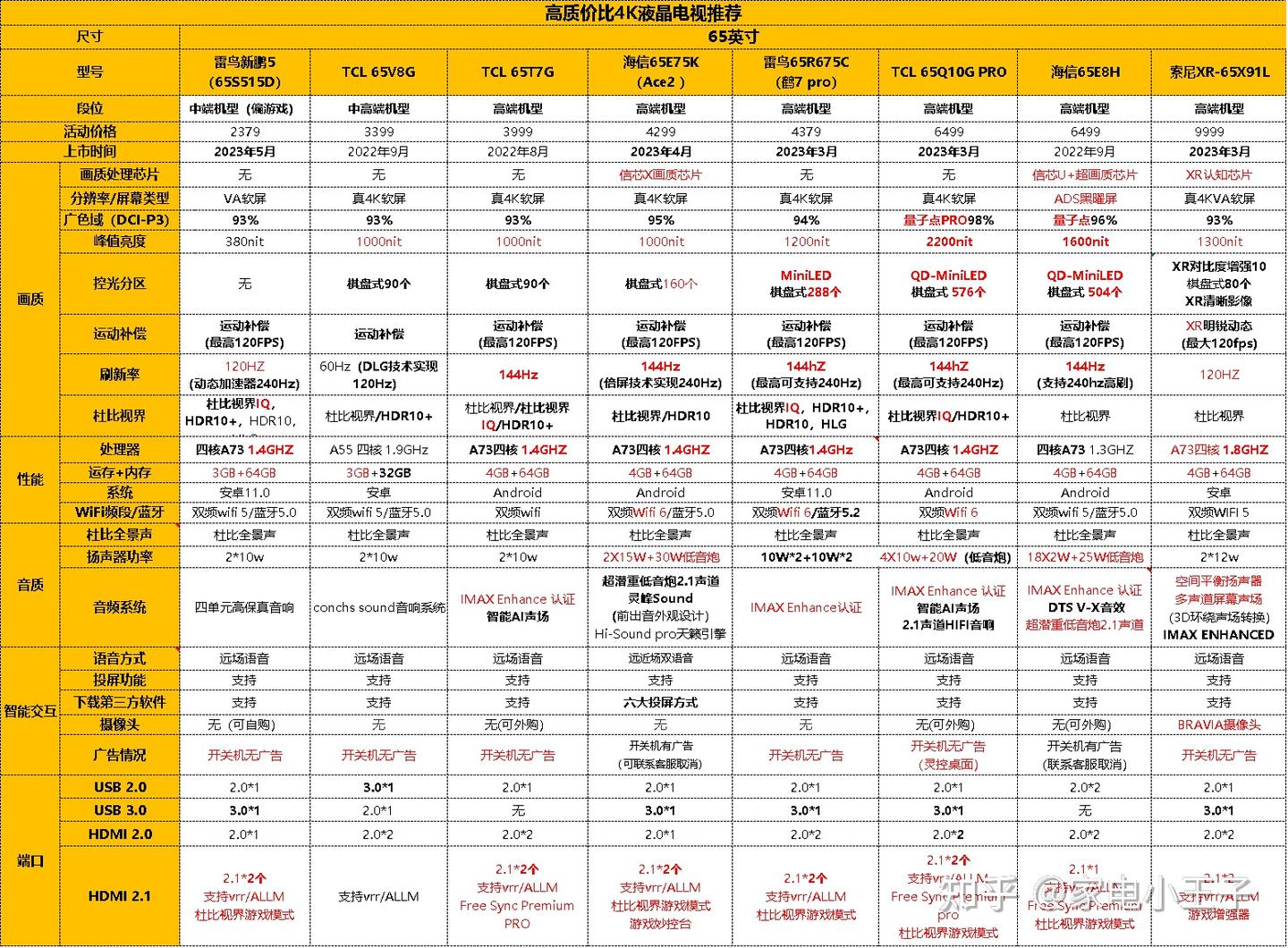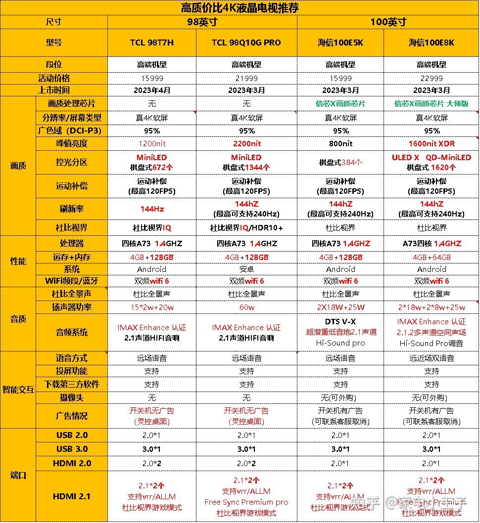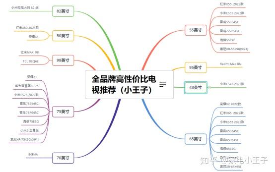 五、全品牌高性价比电视机推荐和简评友情提示:43寸~100英寸,每个尺寸都标注推荐型号的段位和上市时间。